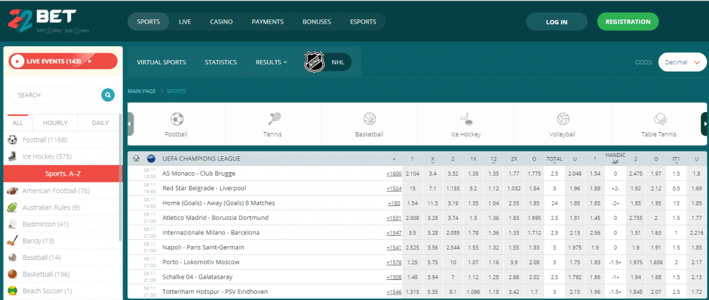 There are a few dozen sports available to bet on at 22Bet. To that end, you can wager bets on American football, badminton, bandy, baseball, basketball, beach soccer, Formula 1, futsal, handball, horse racing – and many other sports. To tell you the truth, there is even a virtual sports betting section. We’re really pleasantly surprised at the vast number of sports that are available to bet on at 22Bet. We hope you will enjoy betting on some of them yourself.