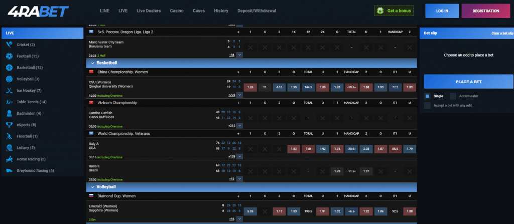 The sports available with 4rabet are cricket, football, basketball, tennis, volleyball, UFC, greyhound racing, esports, table tennis, ice hockey, martial arts and horse racing. In addition to this range of sports, there are various markets available that are specific to each event.