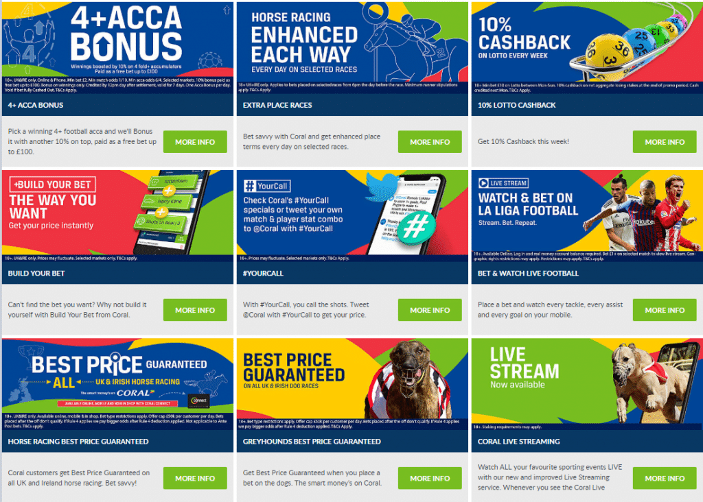 - 4+ Acca Boost: Each time you place at least £2 on 4 or more football selections and win, you will get a 10% boost to your return in free bets. Remember to enter the Coral Promo Code in order to get all the offers mentioned above.