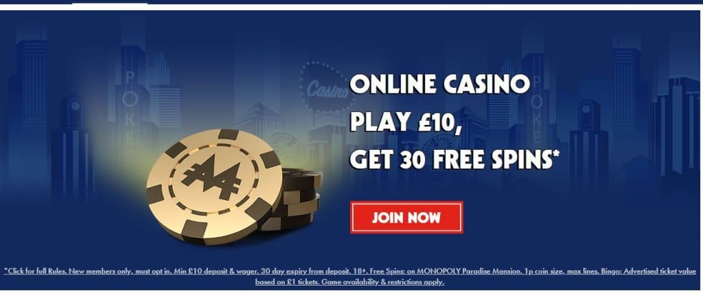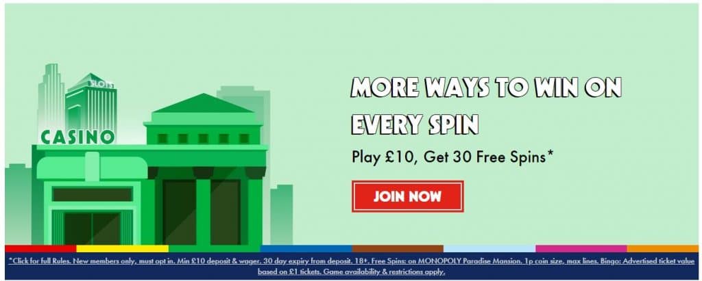| Casino | Play £10 and Get 30 Free Spins on Monopoly Paradise Mansion | JOIN NOW |